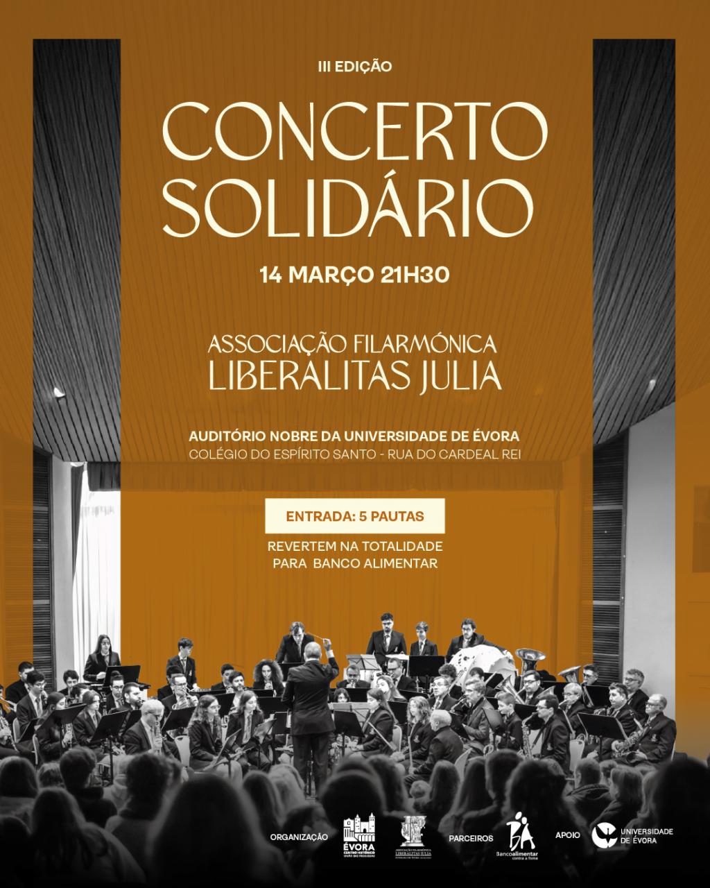 Este sábado, 14 de março, às 21h30, o Colégio do Espírito Santo recebe a III Edição do Concerto Solidário, uma iniciativa da União das Freguesias de Évora (Centro Histórico) em co-produção com a Associação Filarmónica Liberalitas Julia.